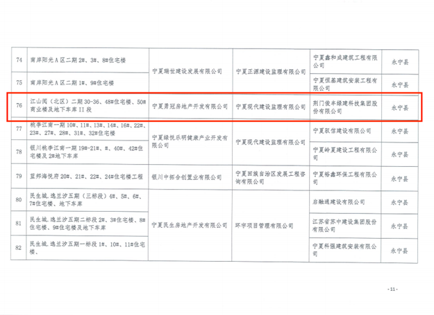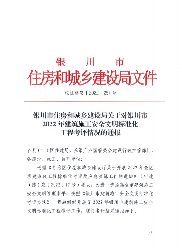 |   2022年11月,銀川市住建局組織開(kāi)展了2022年銀川市建筑施工安全文明標準化工程考評工作。寧夏勇冠房地產(chǎn)開(kāi)發(fā)有限公司開(kāi)發(fā)建設的江山閱(北區)二期30-36、48#住宅樓、50#商業(yè)樓及地下車(chē)庫Ⅱ段工程被授予“建筑施工安全文明標準化工程”稱(chēng)號。