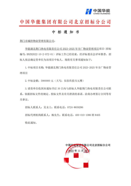 |   11月28日,荊門(mén)城控物業(yè)憑借專(zhuān)業(yè)的管理團隊和良好的企業(yè)信譽(yù),成功中標華能湖北荊門(mén)熱電有限責任公司2023-2025年全廠(chǎng)物業(yè)管理項目,中標金額590萬(wàn)元。