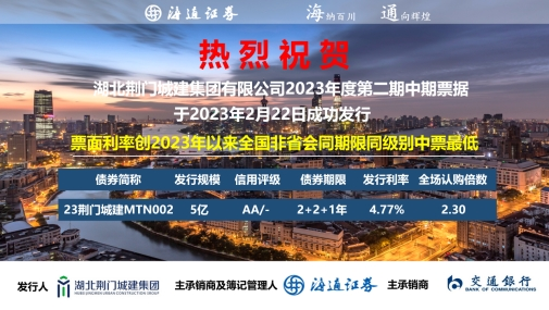 近日,荊門(mén)城建集團成功簿記發(fā)行2023年度第二期中期票據5億元,期限2+2+1年,發(fā)行利率4.77%,該票面利率創(chuàng )2023年以來(lái)全國非省會(huì )同期限同級別中票最低。