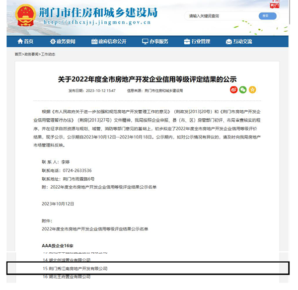 秀江南公司獲2022年度荊門(mén)市房地產(chǎn)開(kāi)發(fā)企業(yè)AAA信用等級評定