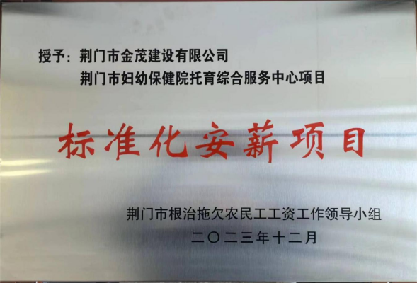 近日,從荊門(mén)市根治拖欠農民工工資工作領(lǐng)導小組辦公室傳來(lái)喜訊,金茂公司承建的荊門(mén)市婦幼保健院托育綜合服務(wù)中心項目榮獲“標準化安薪項目”,這是繼中房?鑫鼎學(xué)府、中房?攬月星辰項目后,金茂公司再度蟬聯(lián)該項榮譽(yù)。