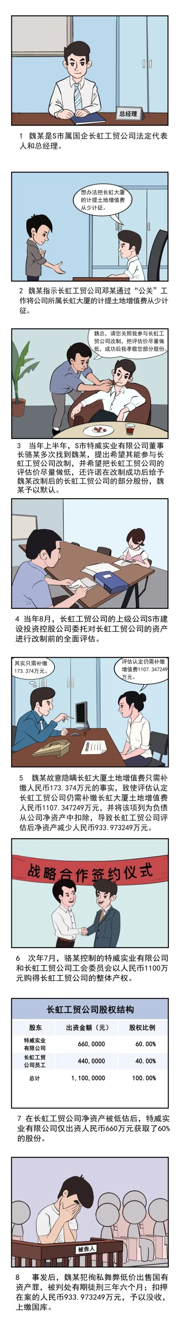 長(cháng)虹工貿公司的上級公司S市建設投資控股公司委托大公會(huì )計師事務(wù)所對長(cháng)虹工貿公司的資產(chǎn)進(jìn)行改制前的全面評估。魏某故意隱瞞長(cháng)虹大廈土地增值費只需補繳人民幣173.374萬(wàn)元的事實(shí),致使評估認定長(cháng)虹工貿公司仍需補繳長(cháng)虹大廈土地增值費人民幣1107.347249萬(wàn)元,并將該項列為負債從公司凈資產(chǎn)中扣除,導致長(cháng)虹工貿公司評估后凈資產(chǎn)減少人民幣933.973249萬(wàn)元。長(cháng)虹工貿公司凈資產(chǎn)被低估之后,駱某控制的特威實(shí)業(yè)有限公司和長(cháng)虹工貿公司工會(huì )委員會(huì )以人民幣1100萬(wàn)元購得長(cháng)虹工貿公司的整體產(chǎn)權。其中特威實(shí)業(yè)有限公司出資人民幣660萬(wàn)元持有60%的股份,長(cháng)虹工貿公司員工出資人民幣440萬(wàn)元持有40%的股份。